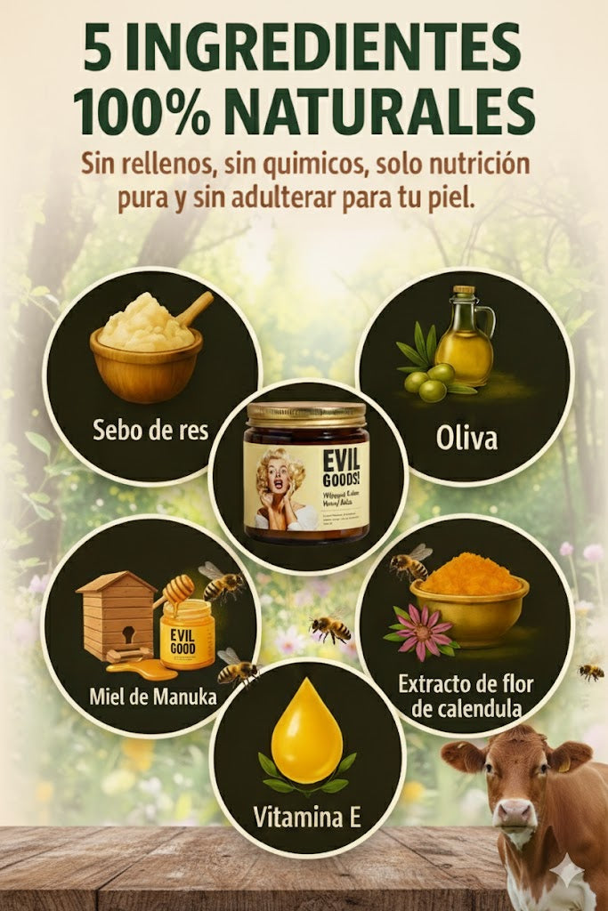 EVIL GOODS es un bálsamo nutritivo que desafía a la industria moderna con solo tres ingredientes ancestrales perfectamente equilibrados:
